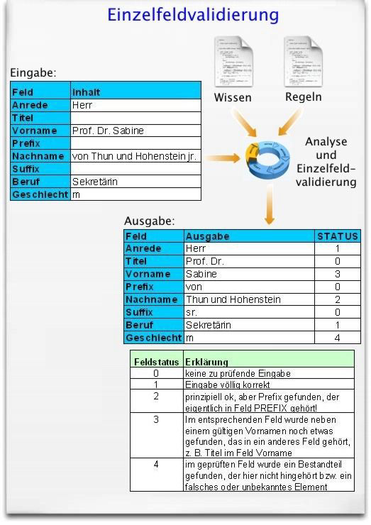 Bei der Einzelfeldvalidierung kann jedes Eingabefeld separat auf den richtigen Inhalt überprüft werden. Hierbei können auch geringfügige, gefahrlos mögliche Umstrukturierungen vorgenommen werden, wenn z.B. ein Titel im Vornamensfeld eingegeben wurde. Diese Funktion ist besonders hilfreich im Online-Bereich oder bei Eingaben von namensrelevanten Adressdaten im Internet.