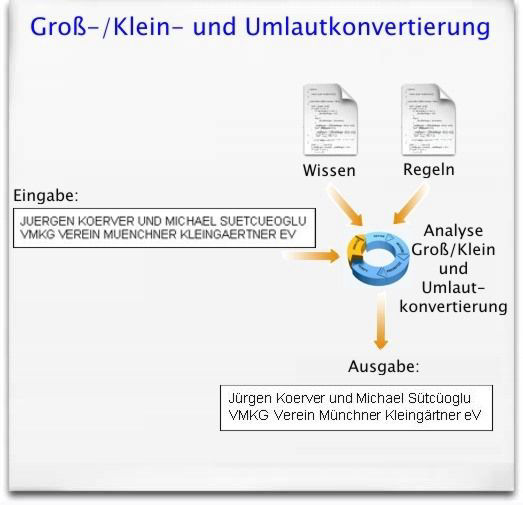 Die Konvertierung der Groß/Kleinbuchstaben und Umlaute ist mit der AS ConvertBox ebenso einfach wie effizient. Bei einer Konvertierung wird das jeweilige Wort mit Hilfe der Wissens- und Regelbasis der AS ConvertBox verglichen. Hier spielen auch die Frequenzen der jeweiligen Schreibweise eine wichtige Rolle. So kommt z.B. der Nachname "Koerver" öfter mit "oe" vor als mit "ö". Der Nachname "Müller" hingegen schreibt sich öfter mit "ü" als mit "ue".
