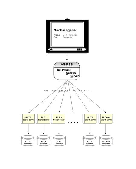 Die somit gewonnene Möglichkeit der parallelen Suche erfordert ein zentrales Modul, das einerseits die Weiterleitung einer Suchanfrage and die Einzelprozesse je PLZ-Bereich weiterleitet und ebenso die von diesen zurückgelieferten Resultate wieder bündelt und als Gesamtergebnis zur Verfügung stellt. Diese Aufgabe übernimmt das Modul „AS Parallel Search Server“ (AS PSS).